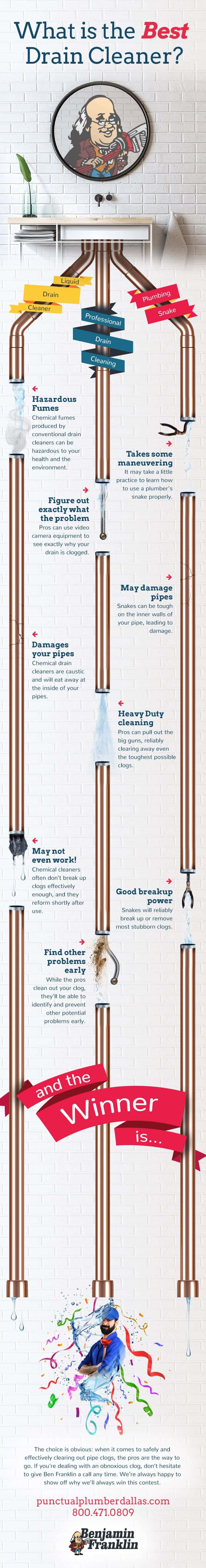 Of course, you don’t want to compare and contrast drain cleaning methods yourself. And why would you? That’s what we’re here for! In this infographic, we compared the three main drain cleaners to figure out which one works best, once and for all. In the process, we figured out each approaches’ main advantages and disadvantages. Here’s what we found out: